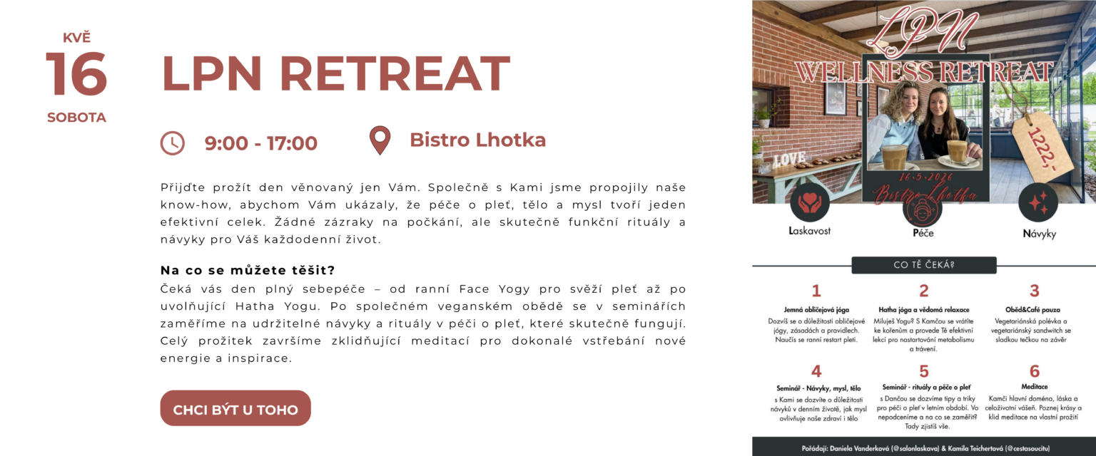 Krása začíná u laskavosti, kterou věnujeme samy sobě. V Salonu Laskavá proto tvořím prostor pro setkávání i mimo masážní lehátko. Moje akce – od kurzů Face Yogy po celodenní retreaty – jsou tu pro váš restart, novou energii a chvíle, kdy se stanete prioritou vy sama. Pojďte se společně zastavit a v kruhu stejně naladěných žen pečovat o svou pleť i mysl.